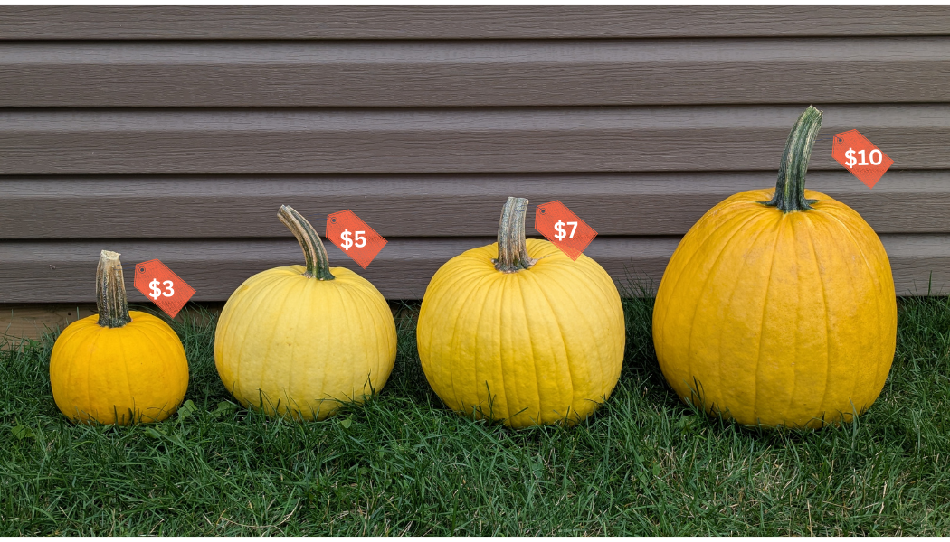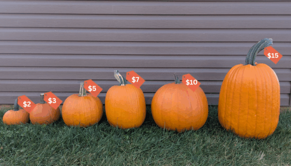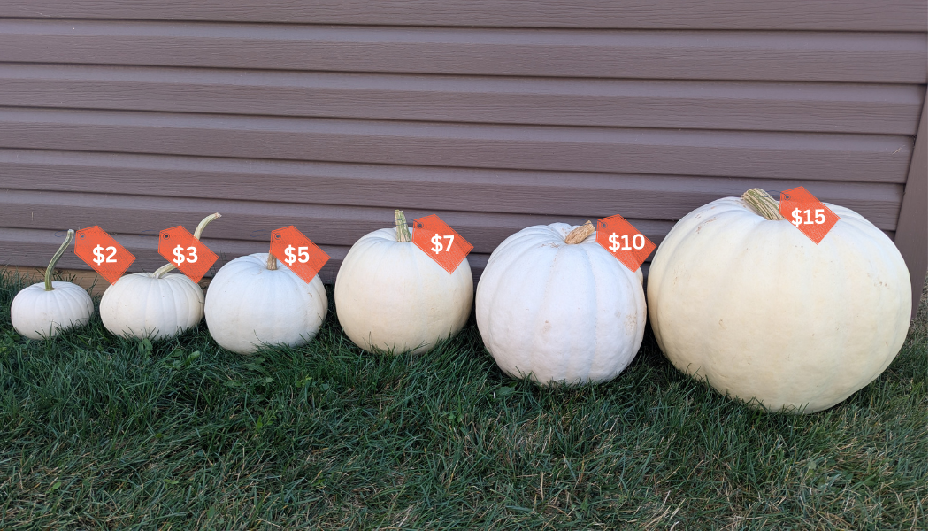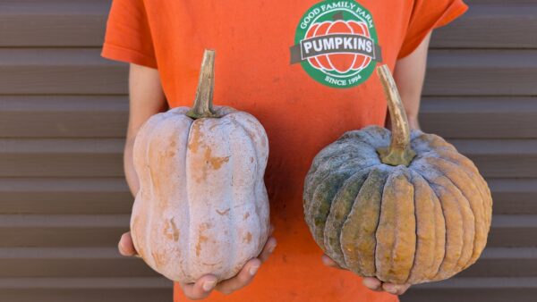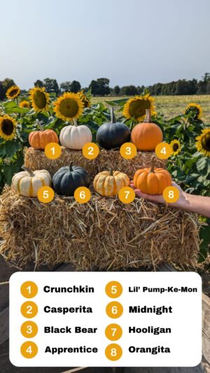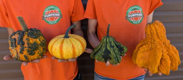 We have orange, white and yellow pumpkins available for purchase. Each variety comes in a range of sizes from small to extra large. We even grow a limited selection of giant pumpkins. There is also a great selection of specialty pumpkins – blue, pink, green, striped, flat, round, warty -that add flare and creativity to your fall display. See Specialty Pumpkin products below.